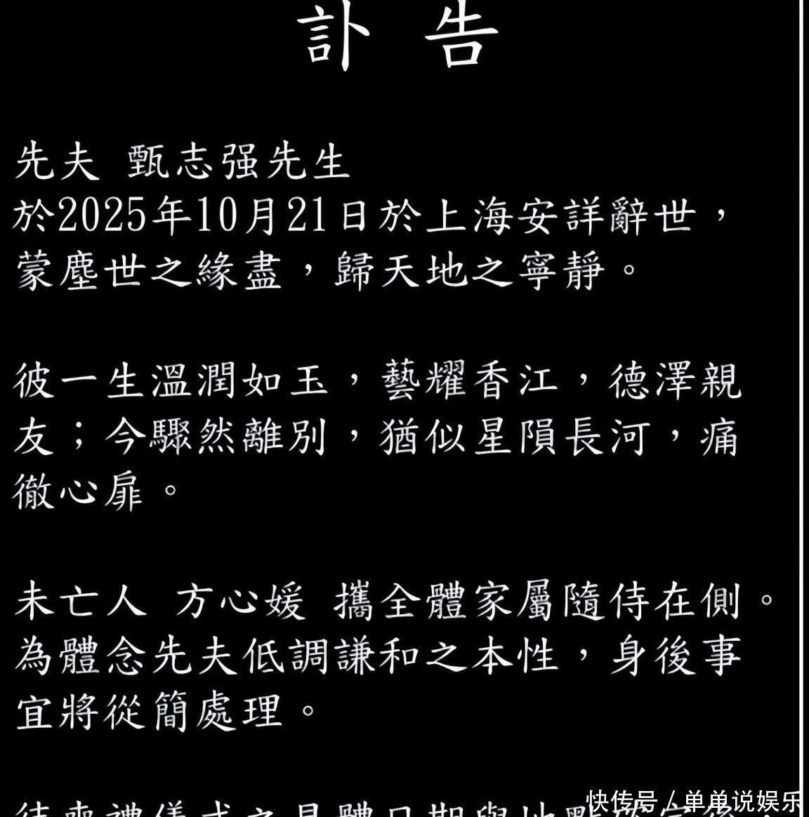 妻子的一则讣告揭开了迟来七天的噩耗,家人之所以延迟公开也是想给自己一点时间,但这份低调还是没能阻挡外界的喧嚣。继朱媛媛和许绍雄离世后我们的心情还没平复过来,他离世的消息又被公开我们我们实在是难以接受真的很痛心。